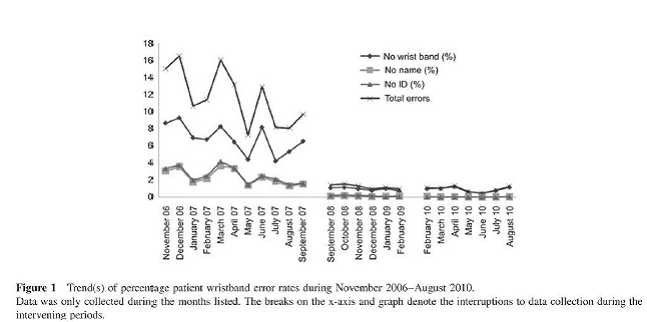 The large number of measurements (77,153) made during 24 months, spanning a period of 45 months, would support that the data being presented is valid, and any reported improvement(s) should not be attributed to chance occurrence. Although patient wristband error rates between 0.2% and 0.3% as suggested by Howanitz et al. (6) were not obtained, the authors are confident that with continuous long term monitoring and educational activities, our institution will come close to achieving this target. We acknowledge a limitation of this study was that not all inpatient units, outpatient clinics, emergency departments and the three satellite establishments (two primary care centers; one hospital) were included.