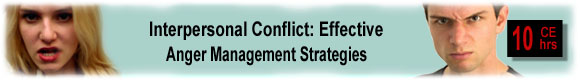 Step #1 - Read Section 1 then Answer Question 1. Question 1 is located at the end of Section 1. Then, click on the Test link found at the end of Section 1 to answer question 1. Read Section 2. Answer question 2 and so on. Step #2 - After completing and scoring the Test a Certificate granting 10 CE credits is issued to you. Course Descriptions: This course mainly focuses on the area of anger management regarding effective strategies for out of control clients. It draws attention to, for example, Giving Your Client Insights into 4 Implications of Choosing Anger and specific content a therapist could use in his or her next session. Coordinating Instructor: Tracy Appleton, LCSW, MEd