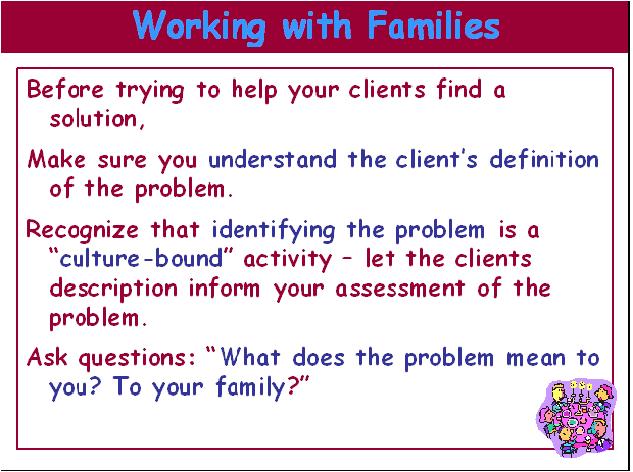3 Question 3 | Test | Table of Contents Always check in with the families to make sure that you understand what they are telling you. Some people use euphemisms, a variety of terms, they’ll say things in ways so they don’t have to put the truth out there. Listen to everything they’re telling you so you can key in on what is the real issue here. And when you are working with families don’t assume that the issue that brought them in is the issue that really needs the most attention. Sometimes they come in with kind of a safe problem: a child is misbehaving in school but there is a lot more going on underneath the surface and to get to that, you are really going to have to show interest, listen to them, and build a strong relationship with them. Acknowledge the differences, know that you are different. You can even acknowledge that you are different, you know that they don’t come from a culture similar to yours, tell me more about your culture. What do I need to know about you Jason to best serve you as your Counselor? Don’t be afraid to tell them you need to know more, that you want to understand their perspective. Very important. Before trying to help your clients find a solution, make sure you understand their definition of the problem. Now every so often we kind of think oh there’s a child in trouble at school, we need to get to the school counselor, we need to talk to the teacher, we need to do the ADHD checklist. Maybe not that single problem. Help them find the best definition for what’s happening in their family. Recognize that identifying a problem is very much a “culture-bound” activity. If you look at the DSM-IV today, at the back of it is a whole section on “culture-bound” disorders, because they are unique to certain cultures. So when we get the DSM-IV out and we’re looking at Panic Disorder, there are some other syndromes that are native to different cultures where it is not really Panic Disorder, it’s something that happens in their culture. It’s just something they expect to happen. So be aware of that. Let the client’s description inform your assessment. Always let what’s going on with the family inform what you do in your office. Don’t go quickly to your little binder or Family Counseling Treatment Planner that is generic if you are working with a family who is different from families this was written for. Make sure you check in the source. And ask questions about what does the problem mean to you, to your family? Not just this is what I assume this problem means for you. Ask every member of the family, “What does it mean to you to have a child who is acting out in school?” Because your answer might be very different from what mine would be if it were my child. You have to be aware that everyone sees things differently and to be open to everybody’s interpretation of what the problem was. Don’t assume you’re just going to talk to the male head of household if he shows up or just to the mom, but everybody has some input because families are affected by the problem, each member. Below