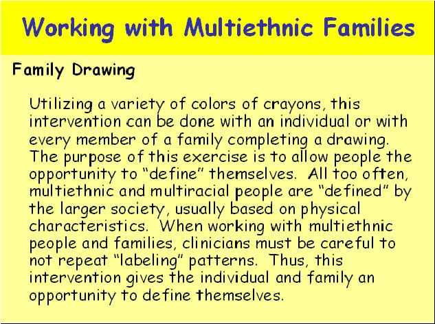 8 Question 8 | Test | Table of Contents Another thing that you can do is the family drawing and this is actually very neat. When I did some research, particularly on multiracial children, there is a vast majority, just a huge amount of art materials that are designed for race and multiracial kids. I actually have a box of crayons and it’s called “The Multi-Cultural Crayon Box.” It’s sixteen different skin tone colors, ranging from very dark brown to very flush color and anywhere in between. So you have materials like that and throw them out on the table and ask the child, or one of the adults, pick the one that closest matches your skin. Crayola also has colors for eyes and hair and things like that, so it’s very neat because sometimes when that child opens that crayon box and they say, “Well okay I’m not black, I’m not white, where do I fit in all this?” They have dowels, they have felt, and craft materials. So it’s very, very neat if you’re going to be working with these families on a regular basis, I do strongly encourage you to have some of those things because this may be the first time this child has a chance to use things and go, “Wow, look. This does look like me.” So with this, again you do it with an individual or with every member of the family, you want to allow them the opportunity to find themselves. As Suzanne was saying, we don’t want to assume that we know how they define themselves. I’ve used the example before of Tiger Woods. Tiger Woods has a very diverse background and he actually developed a term called, “Cablinasian” to define himself because he’s Caucasian, he’s Asian and so that’s how he defines himself. He came up with his own term. That’s important for these families, they need to figure out who am I and where do I fit in with all of this, especially within large society and within their own extended family. You want to be careful to not repeat labeling patterns. Don’t presume to call them “multiracial family” or a “multiethnic family”. Explain that you’re a different race, how do you say that. How do you tell people about this? What are they comfortable with? And then that gives the individual in the family an opportunity to define themselves and then you as the counselor, the therapist, know where to go from there and how they prefer to be referred to as a family. Below