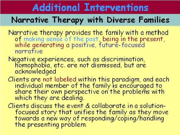 Now we’ll go to narrative therapy that Kim will share with you. Narrative therapy can be very effective with diverse families. Number one reason is that it externalizes the problem. Instead of laying the blame on the family for being different, it externalizes it, it says it’s not your fault for being different, it’s a societal issue. You’re trying to fit into a society which is not as accepting of you and your family. So that can be very powerful for the family.
